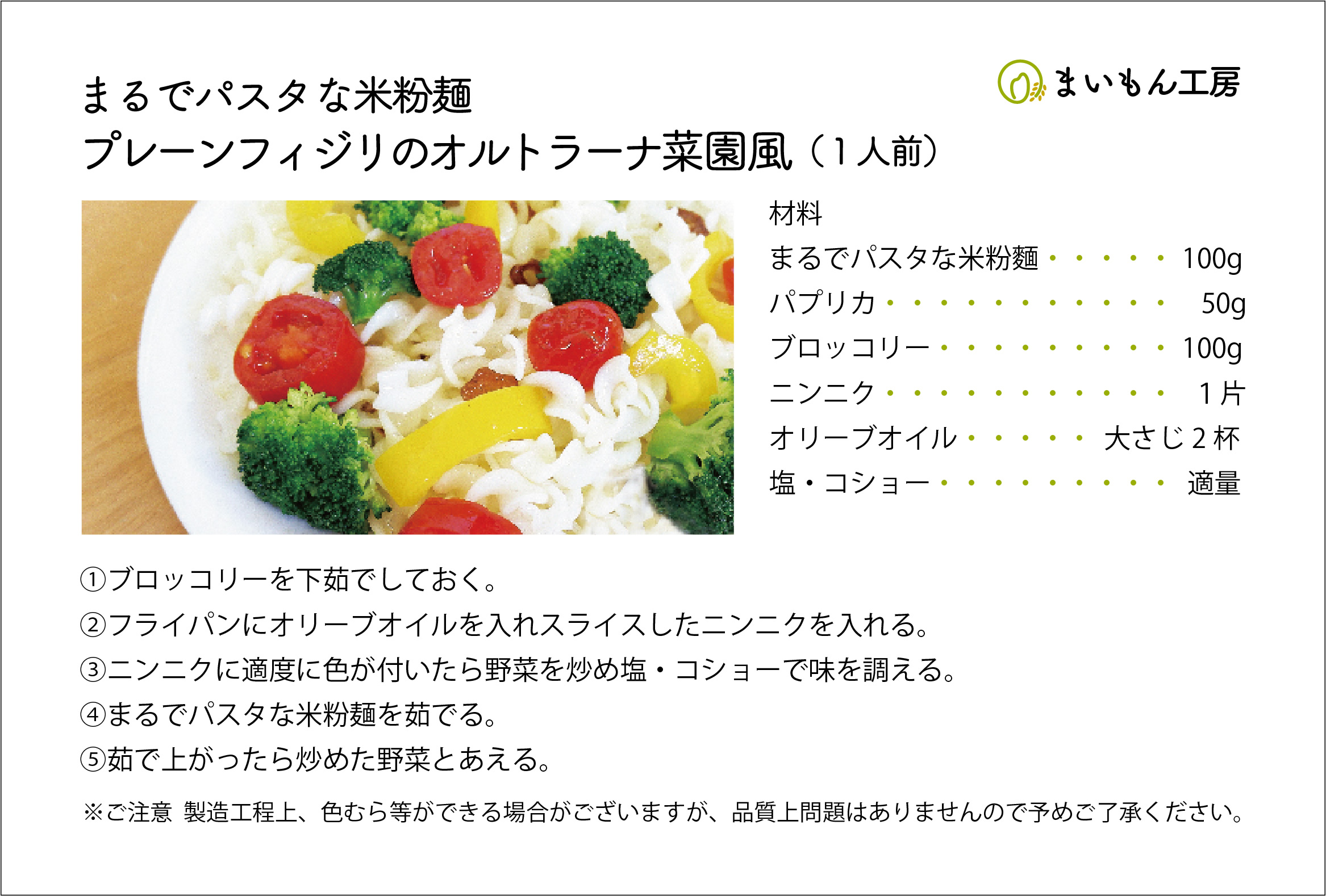 ①ブロッコリーを下茹でしておく。②フライパンにオリーブオイルを入れスライスしたニンニクを入れる。③ニンニクに適度に色が付いたら野菜を炒め塩・コショーで味を調える。④まるでパスタな米粉麺を茹でる。⑤茹で上がったら炒めた野菜とあえる。